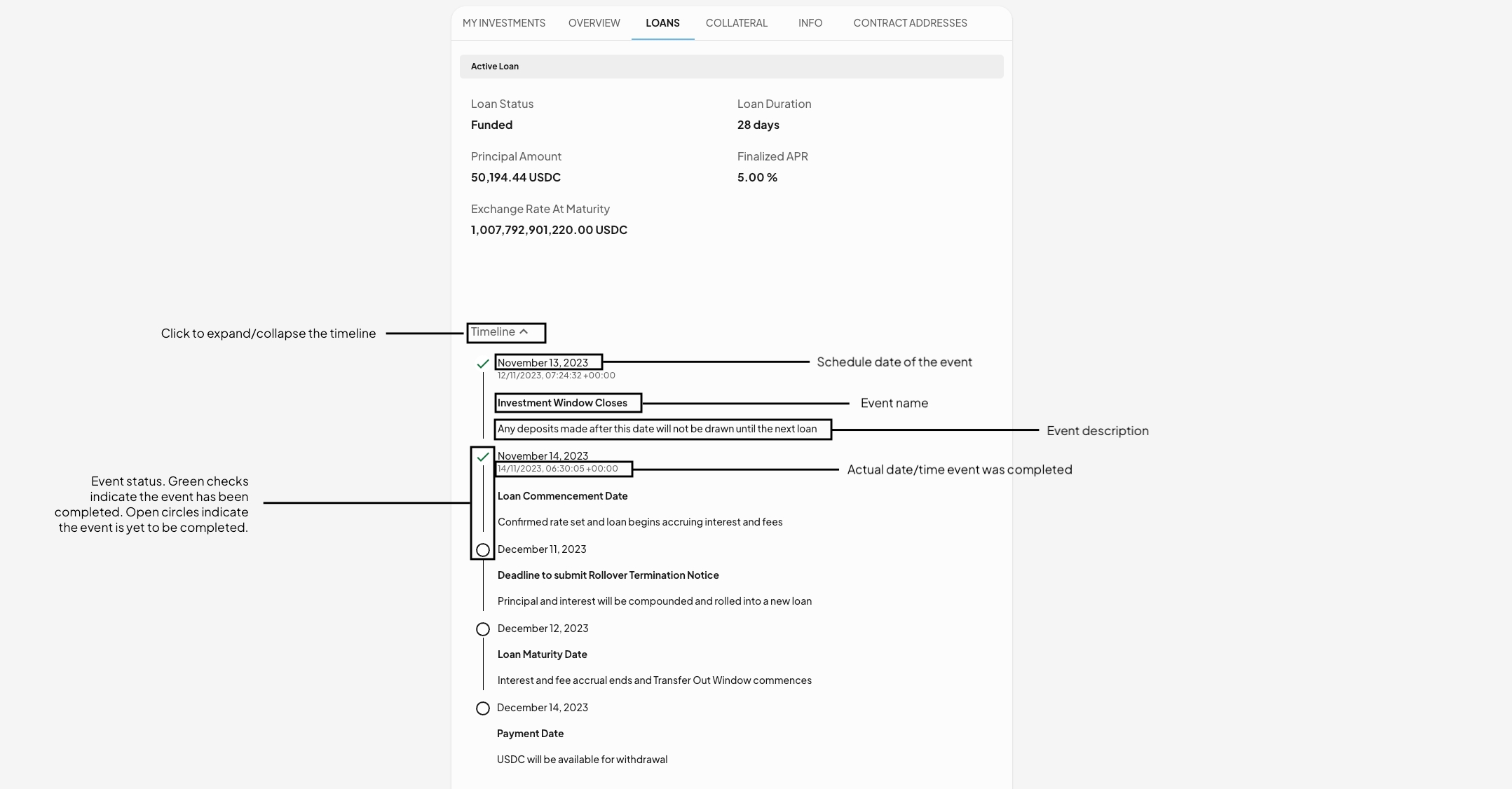 Provides a detailed view of each Loan Cycle, including the status, duration, amount, APR, exchange rate, and timeline.