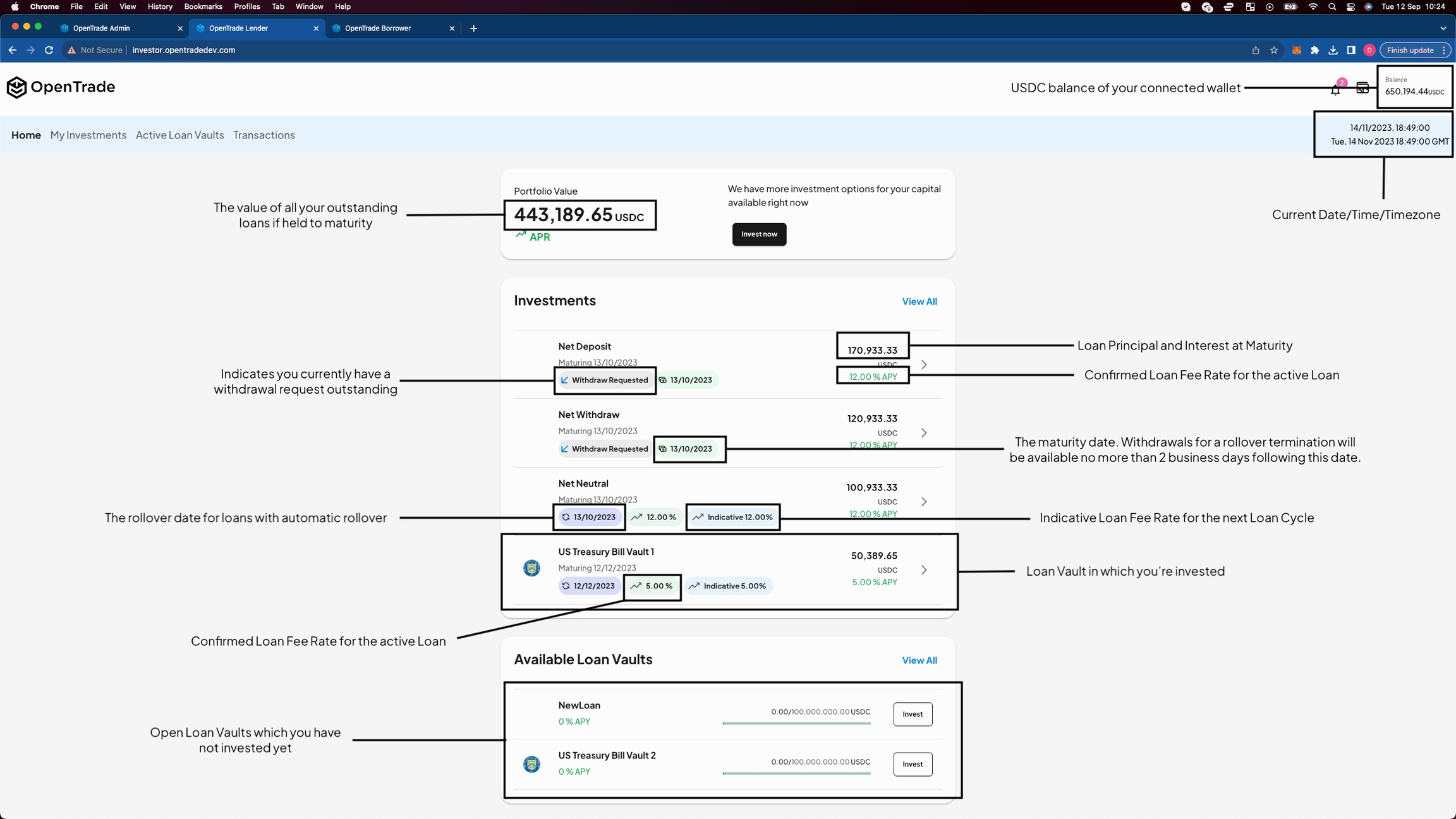 The Lender App is the primary user interface for Lender's using the OpenTrade Platform and its Treasury Management Product.