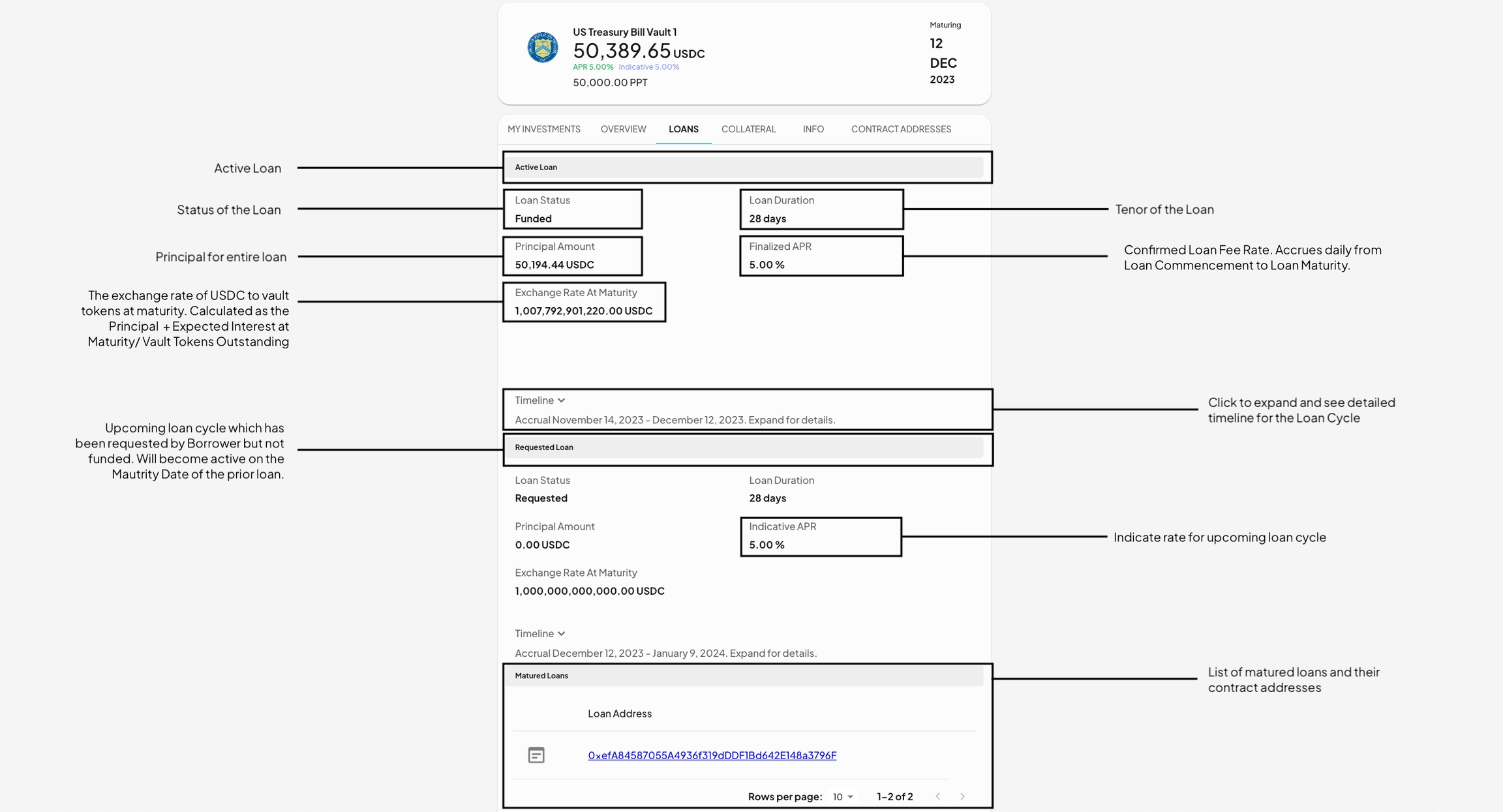 Clicking into one of your investments or available loan vaults will bring you to a more detailed view of the Loan Vault and your holdings.
